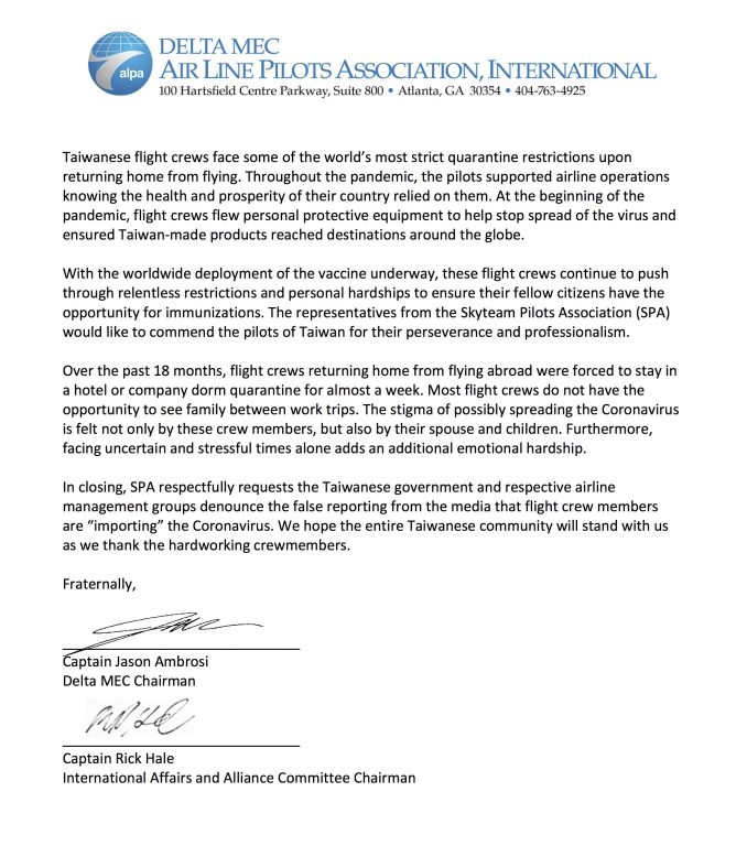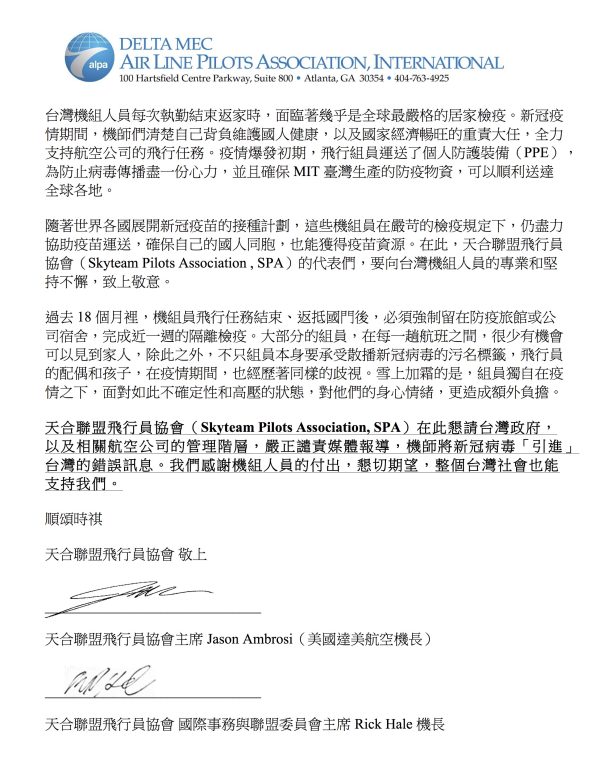 更重要的是,「天合聯盟飛行員協會」在信中最後懇請台灣政府,以及相關航空公司管理階層,應嚴正譴責、導正部分媒體進一步強化污名而傳遞「機師將病毒引進台灣」的錯誤訊息。「天合聯盟飛行員協會」信件,也將透過各項管道,試圖傳達給包括國外媒體與臺灣政府等相關單位。