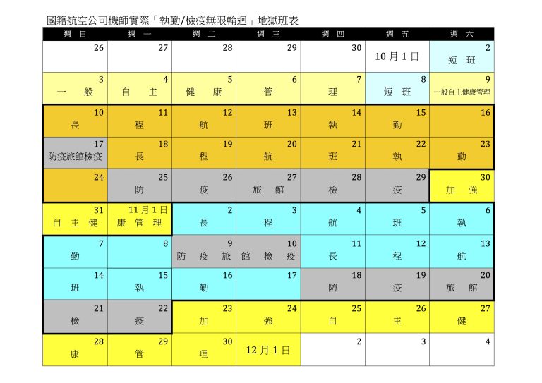 從這一份國籍航空機師10月份與11月份實際班表可以很明確地看到,這位機師在整整兩個月內(10月2日至12月1日),竟然找不到任何一天「不是執勤、不是檢疫、不是加強/自主健康管理」的日子,一天都沒有!」而超過60天的期間內,能夠真正享有行動自由的天數是「零」!最長會有長達44天期間(10月10日至11月22日),僅能有短短的「3天」得以返家見到家人,而這三天還是在加強自主健康管理期間,無法與家人有正常的社交、相處與活動!