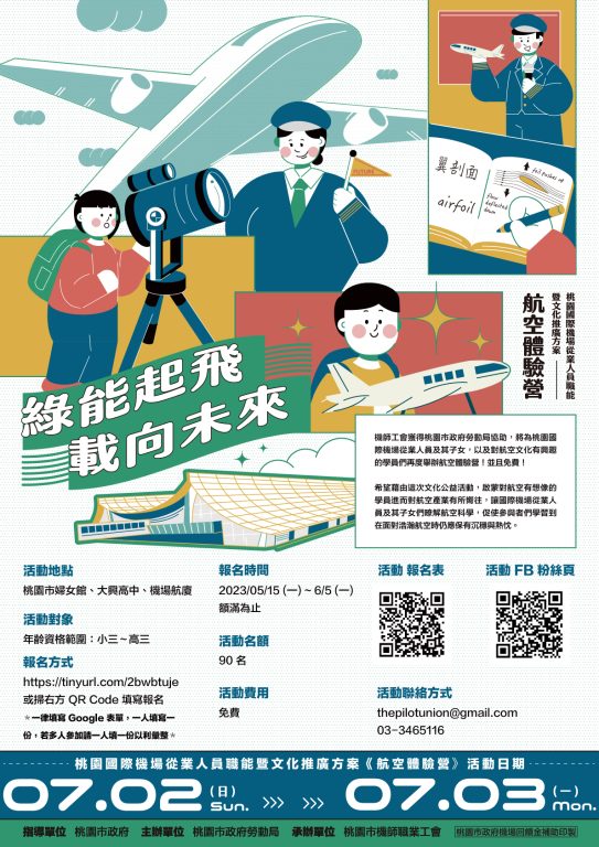今年,機師工會獲得桃園市政府勞動局協助,將為桃園國際機場從業人員及其子女,以及對航空文化有興趣的學員們再度舉辦航空體驗營!並且免費!